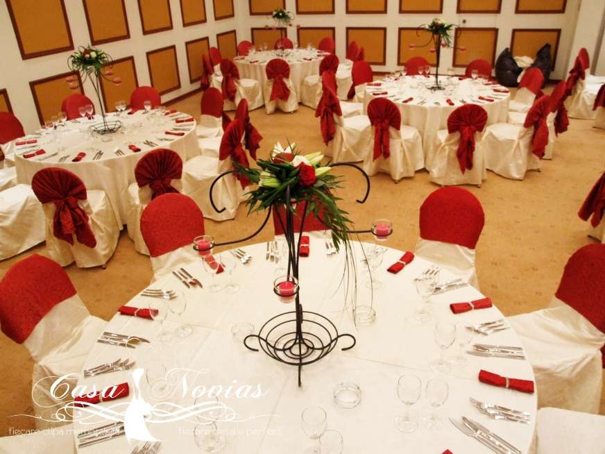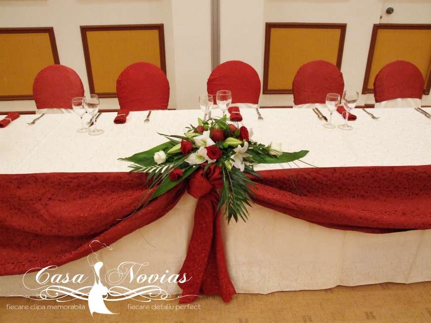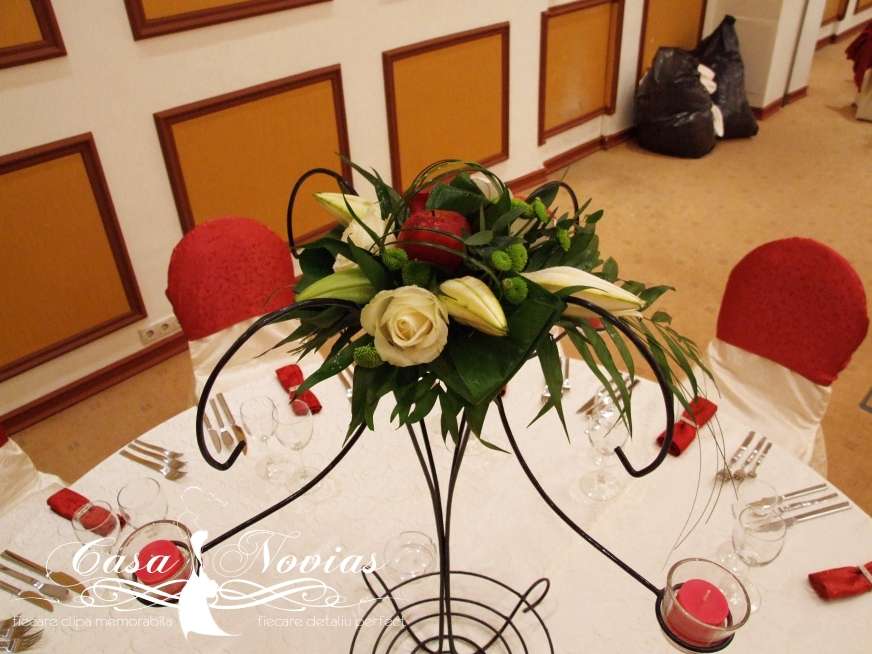 Aranjamentele florale au fost realizate din crini albi, trandafiri, mere rosii si verdeata. Suportii inalti din fier forjat au completat perfect brocartul. Pentru masa de prezidiu am realizat falduri grena pentru a o scoate in evidenta si am ales un aranjament floral asortat cu cele de pe mesele invitatilor.
