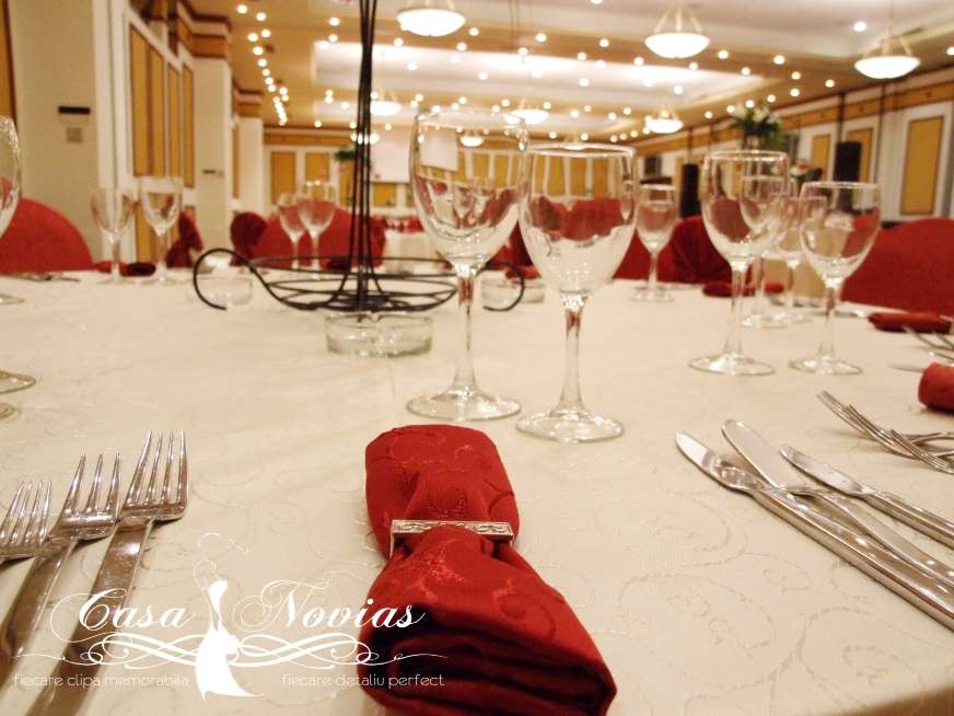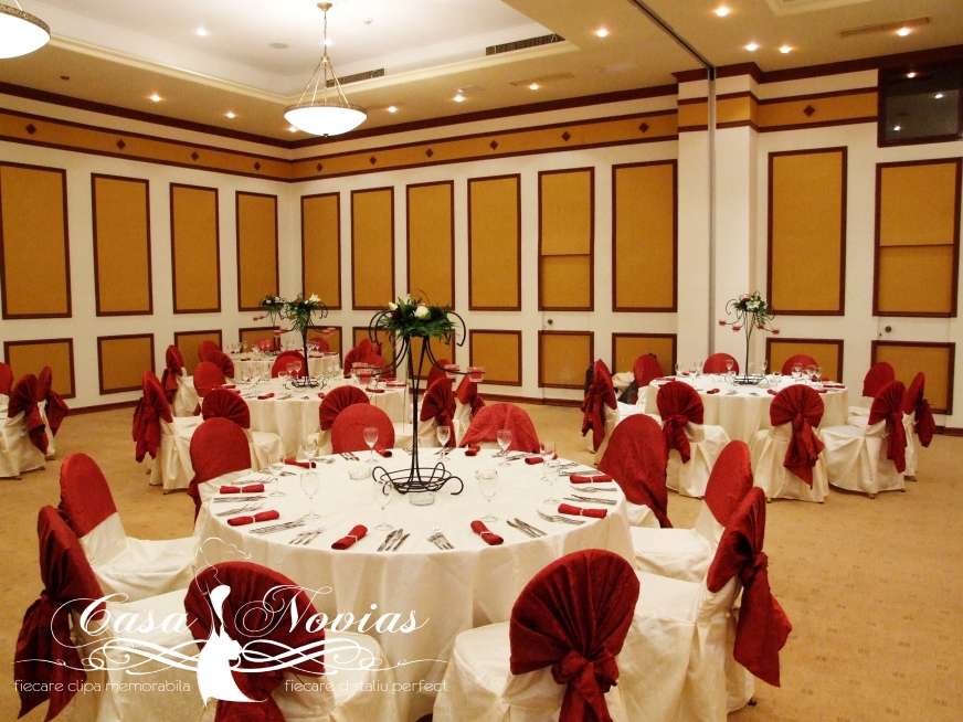Un eveniment cu un decor clasic, elegant, realizat din brocart ivoire si grena. Scaunele au fost imbracate in huse din brocart ivoire croite exact pe forma lor si evidentiate prin funde grena. Fetele de masa au venit in completarea decorului prin nuante de ivoire. Pata de culoare s-a regasit in servetele grena cu inel metalic si in aranjamentul floral.