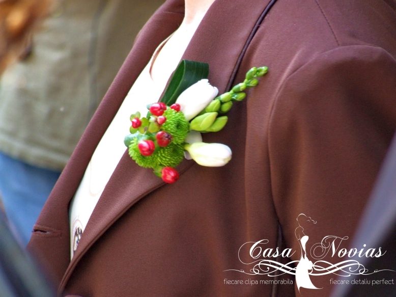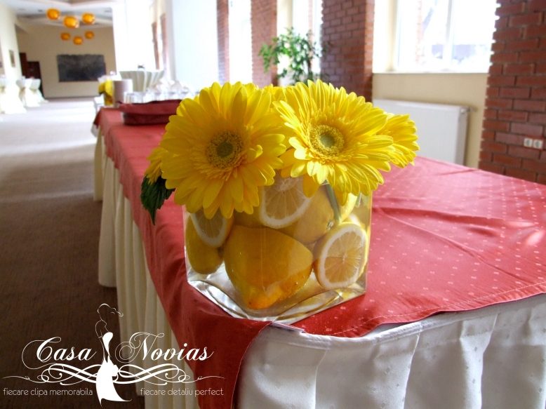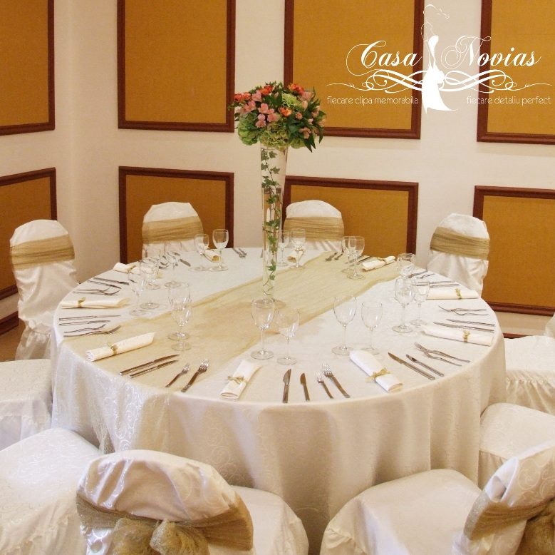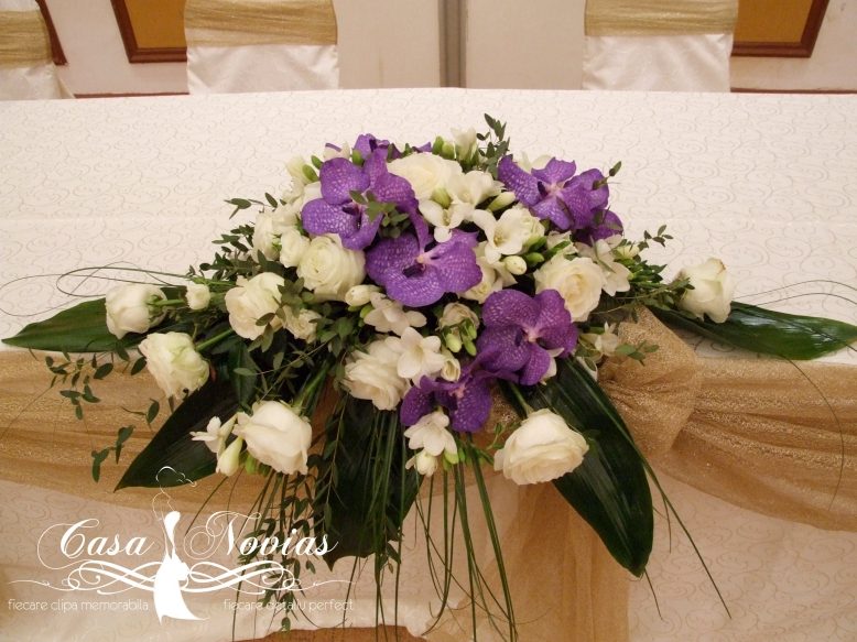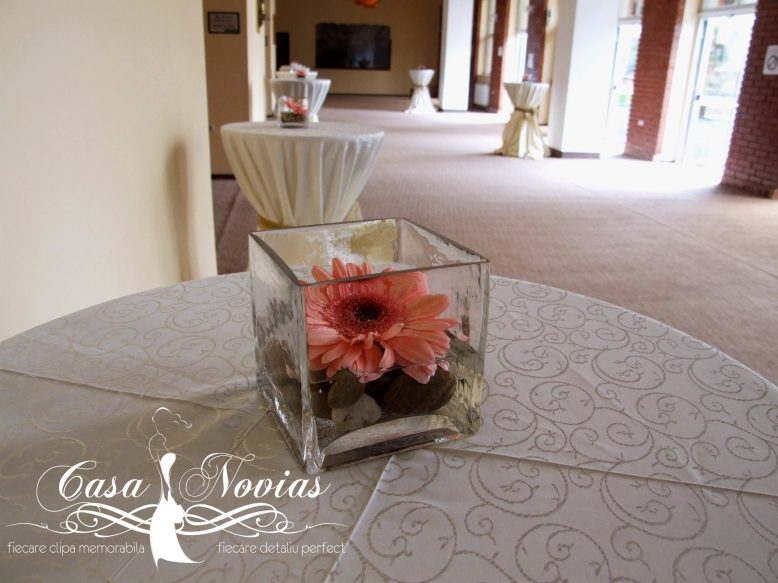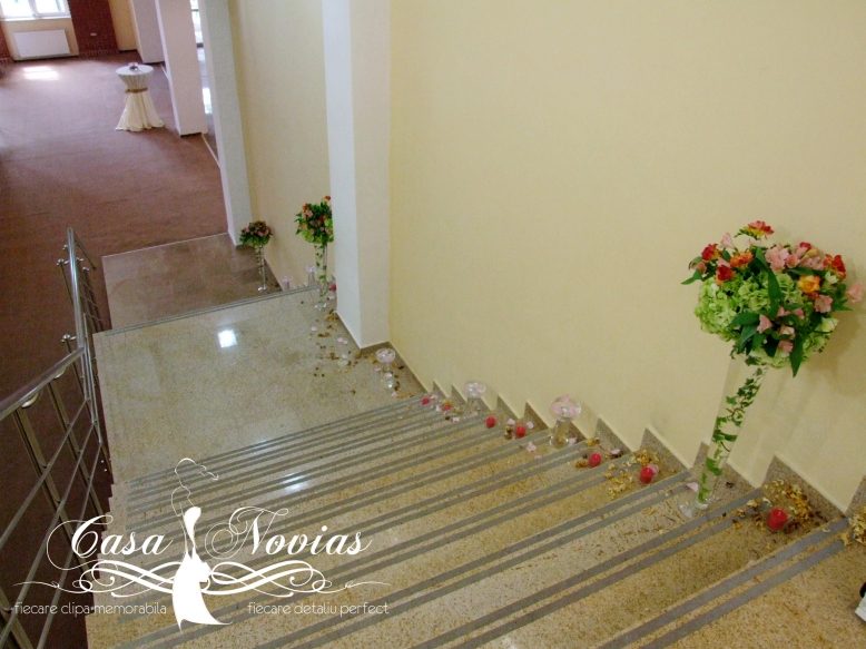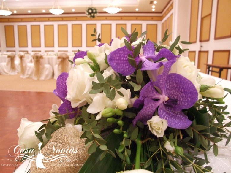 In sala, aranjamentele florale au fost in ton cu aceasta zi superba de primavara: luminoase, fresh si pline de culoare. Elementele decorului au fost: bulgari florali din trandafiri albi, aranjamente florale cu trandafiri si frezii pe mese , hortensii, alstroemeria si frezii colorate pentru vaze inalte, vaze cubice cu lamai si gerbera si pentru un plus de eleganta si stil, accente fine de mov date de vanda, o floare din familia orhideelor foarte rara si selecta.