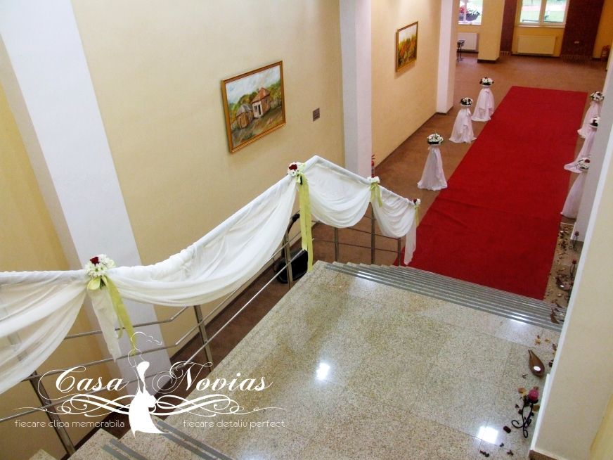 Avantajul folosirii margaretelor este ca se pot realiza aranjamente florale foarte bogate si de asemenea globuri compacte, foarte mari. Am pastrat motivul margarete si pentru decorul intrarii, prin mici buchetele plasate pe balustrada si aranjamente pentru stalpisorii decorativi.